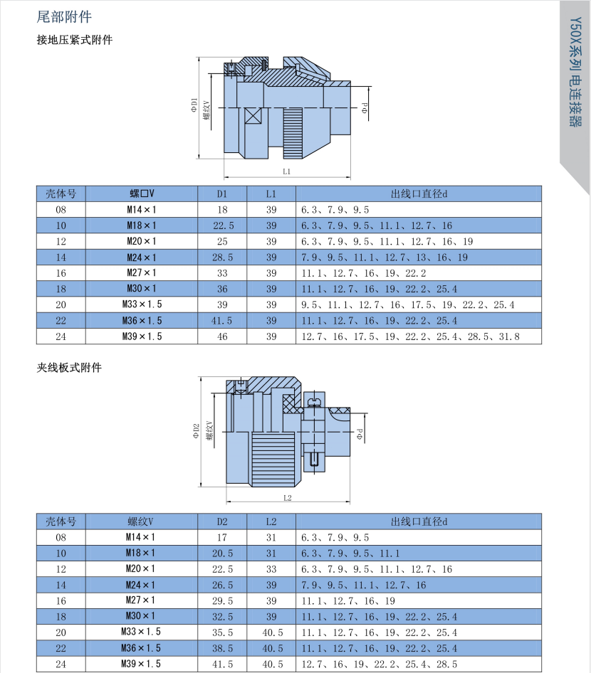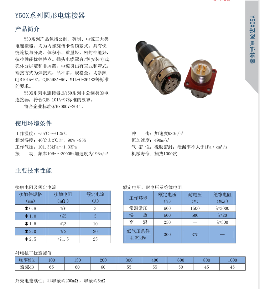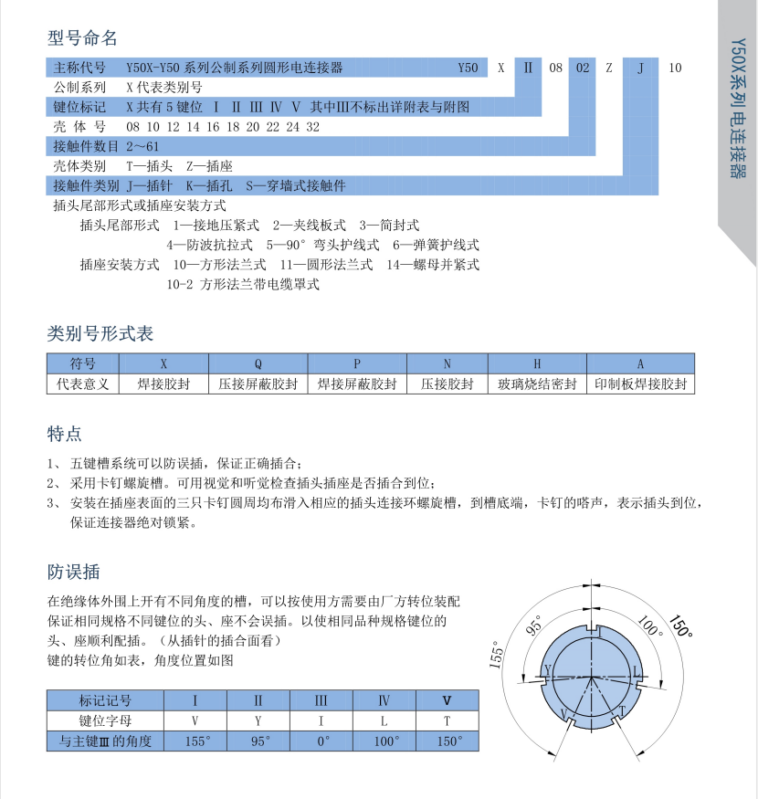 该系列航空插头分三大类,Y50X是公制尺寸,同芯数外壳体尺寸偏大,插座安装方式有方盘式,螺母紧固式及穿墙式,端接形式为焊接式,根据使用环境选择不锈钢或铜、铝合金材料,一般用于战略战术系统,电子对抗系统,通讯信号连接系统 ,进口医疗仪器设备等电能,电讯信号的连接。