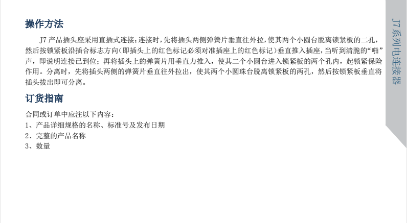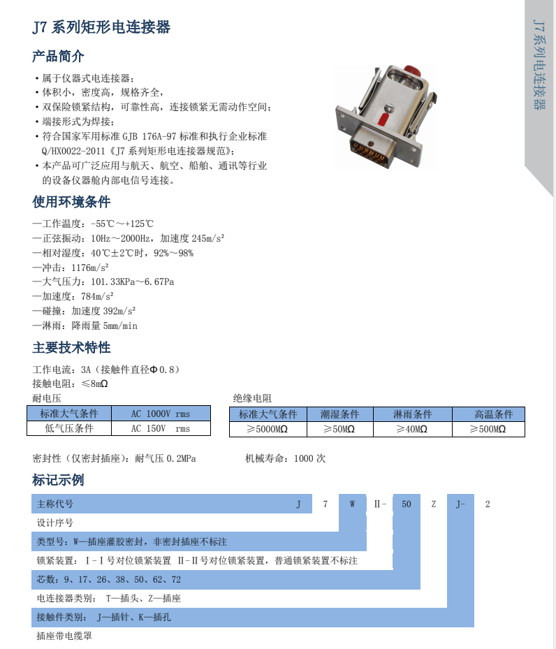 J7矩形电连接器体积小,密度高,双保险锁紧结构,端接形式无需太大的空间,广泛用于航空航天,通讯等行业的设备仪器舱内部的电信号连接。