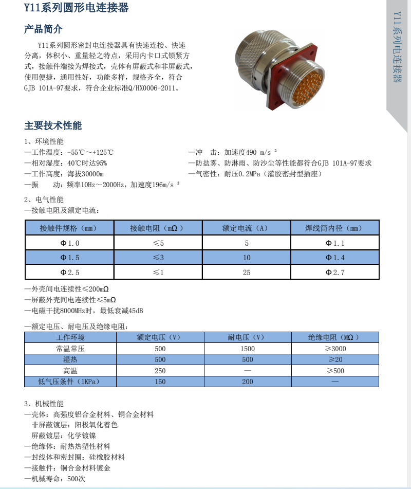 Y11X系列圆形密封连接器,等同于Y50X系列,插座灌胶密封,承受0.2Mpa气压,在室外普通下雨可以正常工作,插头和插座卡口连接,有三只卡销二次锁紧,抗冲击,价廉物美,军民用产品都适应。