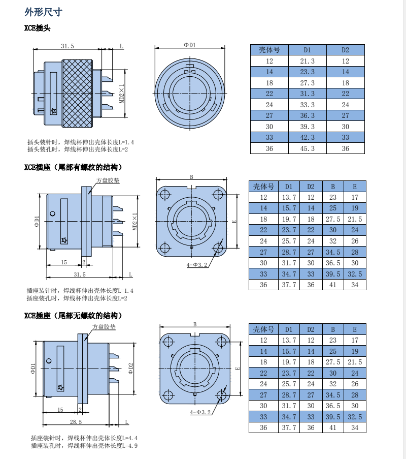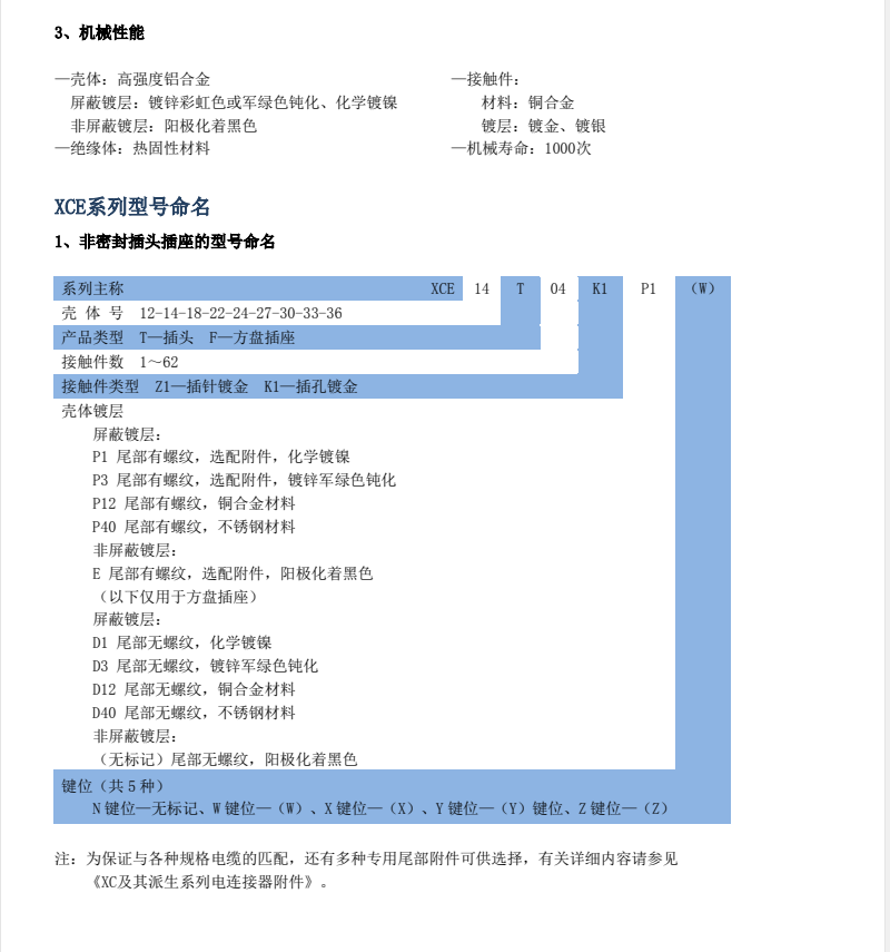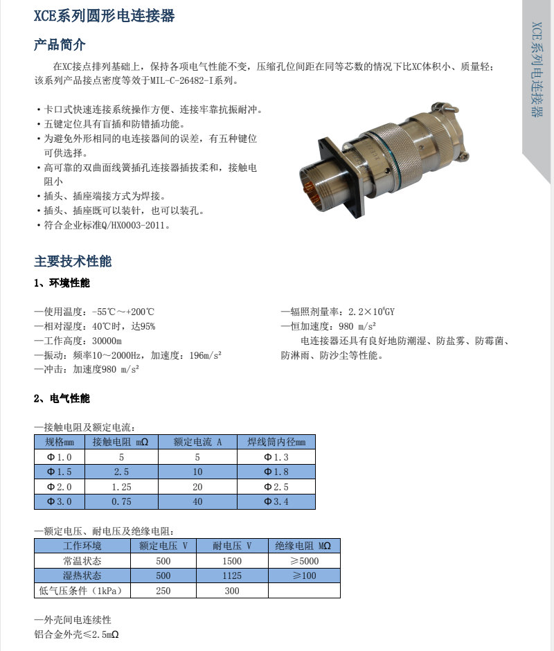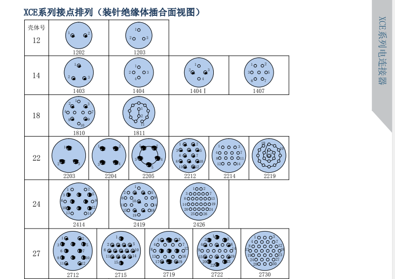 XCE系列圆形电连接器,在XC系列航空插头里,同芯数壳体,直径相对于小一圈,英制尺寸计算,接点密度高,线簧插孔,接触可靠,卡口式双重锁紧。
