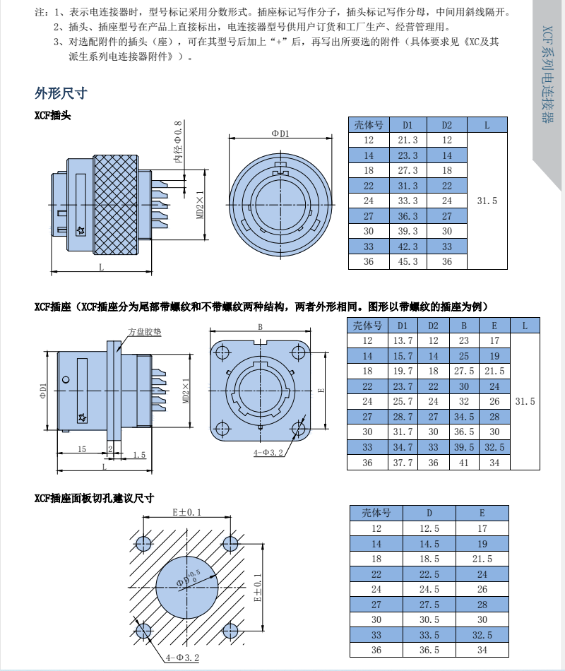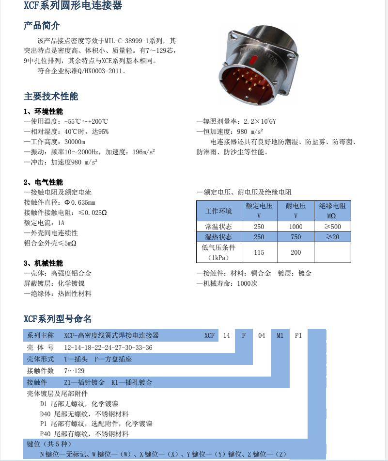 XCF多芯密封圆形电连接器,等效于MIL-C-38999-I系列航空插头,接点密度高,体积小,质量轻,多芯数排列,卡口连接,三只卡销双重锁紧,耐振动抗冲击。