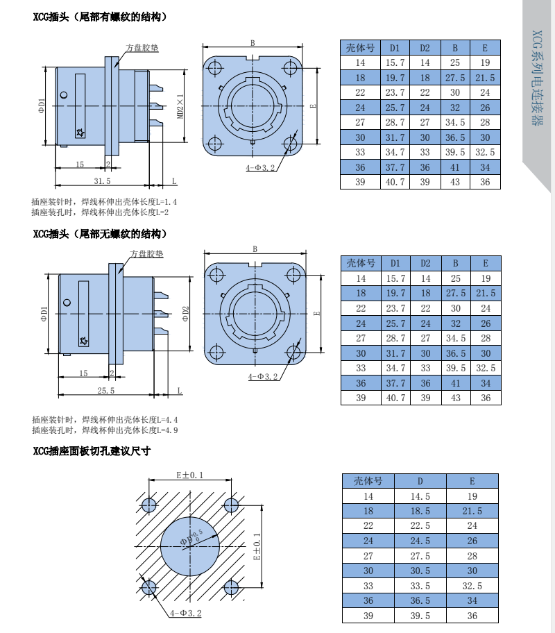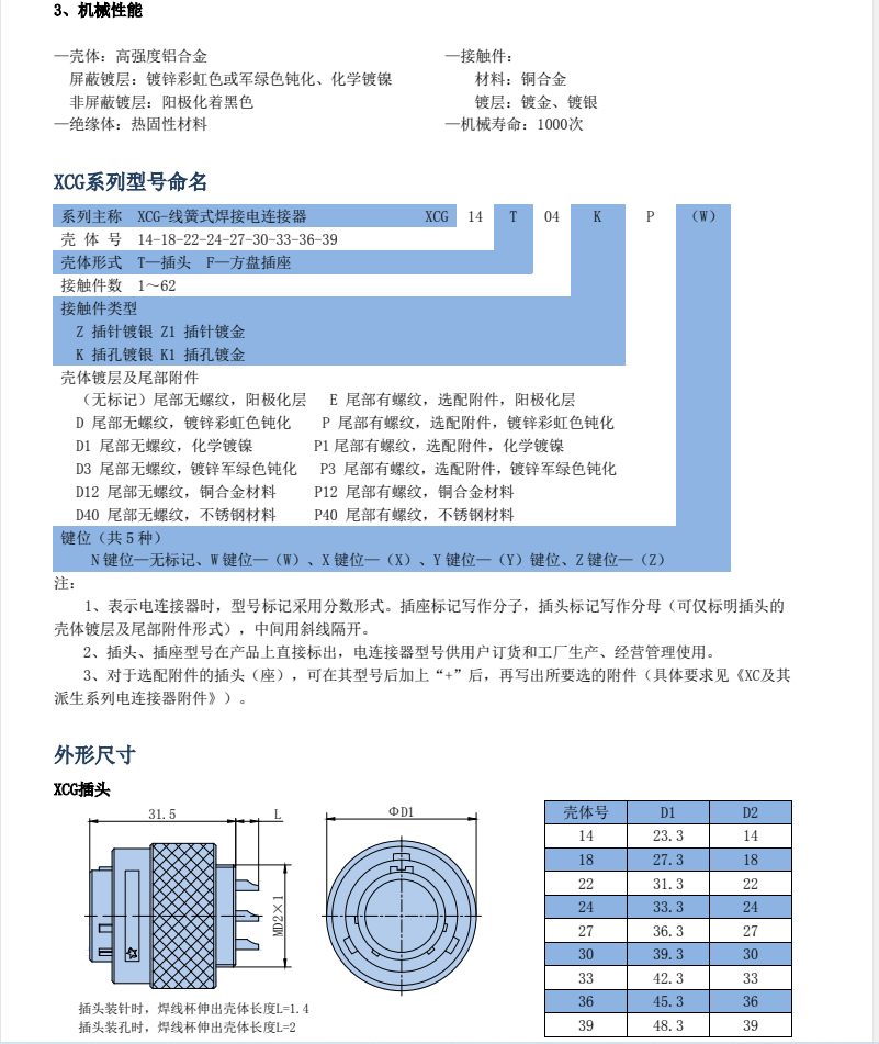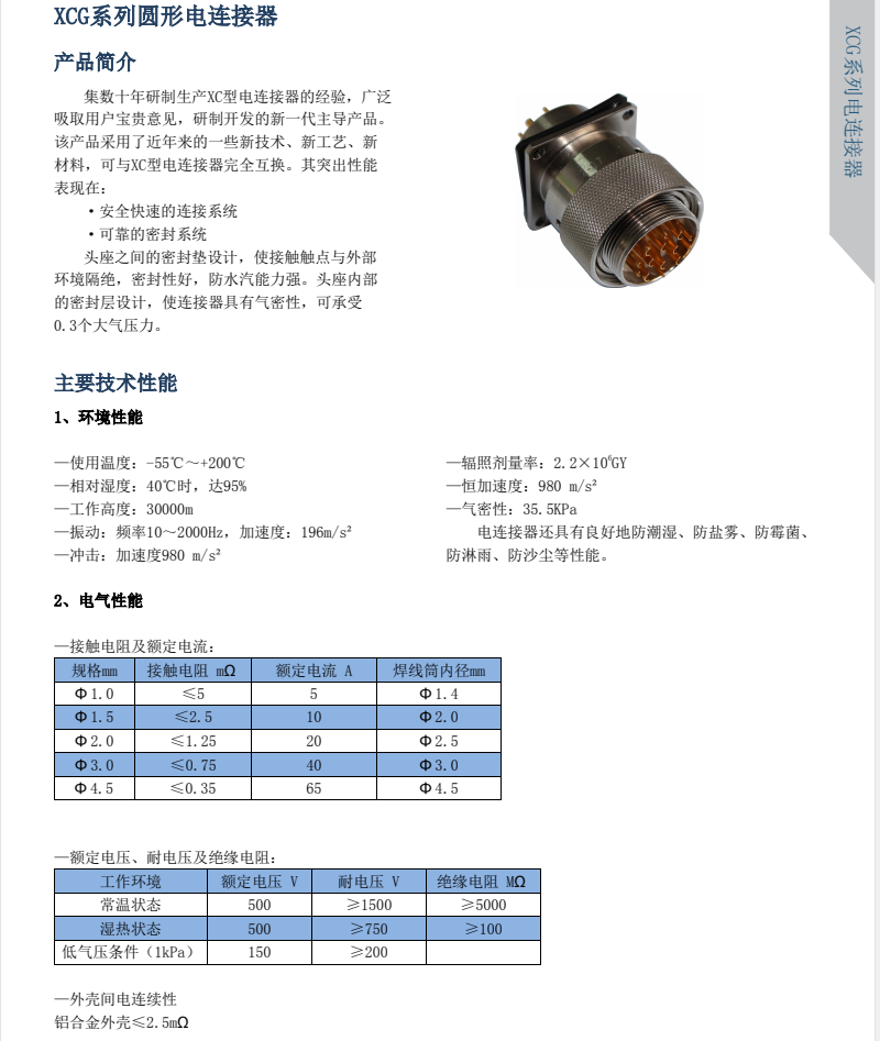 XCG系列圆形航空插头,其尺寸大小与XC系列相同,同等芯数,同等壳体可以互换,特点在于头座之间有密封层设计,密封性能好,可以承受0.3个大气压,一般用于液体罐里外电流或信号的输送。