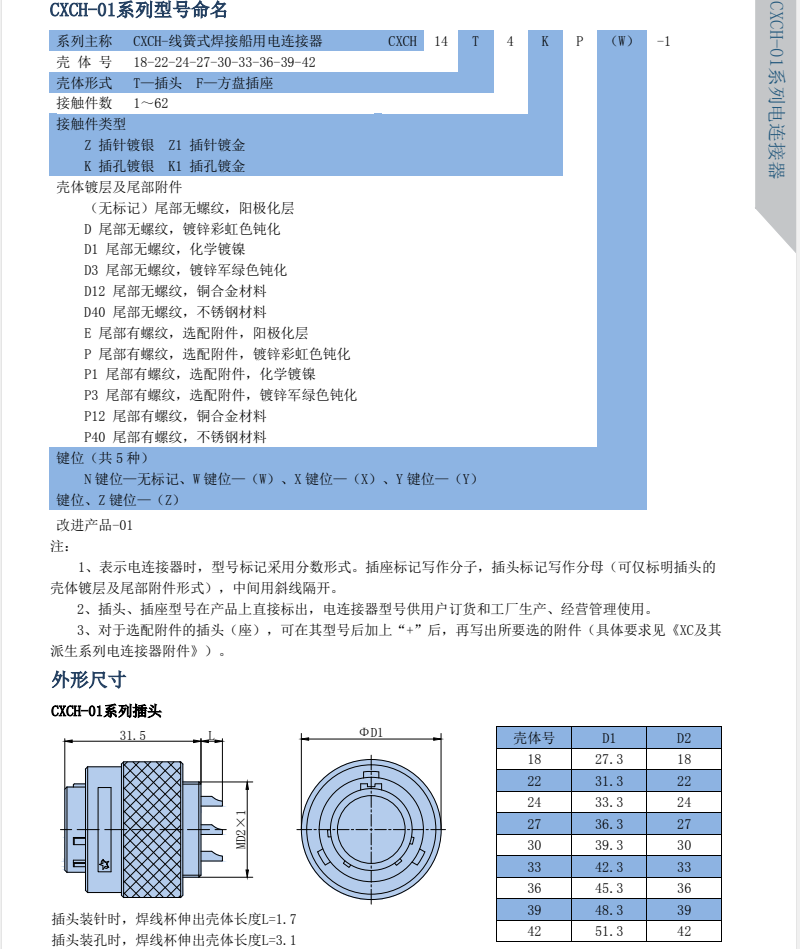 CXCH01圆形电连接器是CXCH的改型产品,不同之处增加了壳体壁厚,提高了产品的机械强度,广泛用于舰船,室外恶劣工作环境。