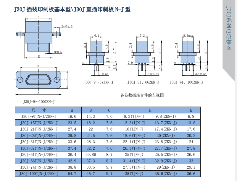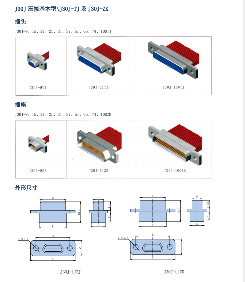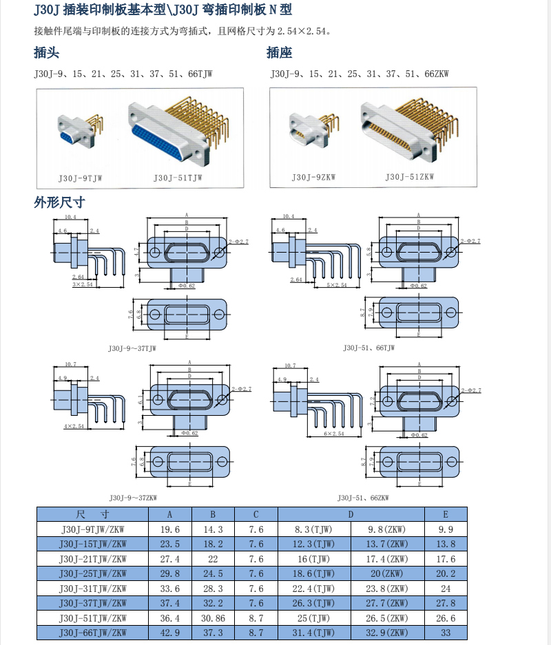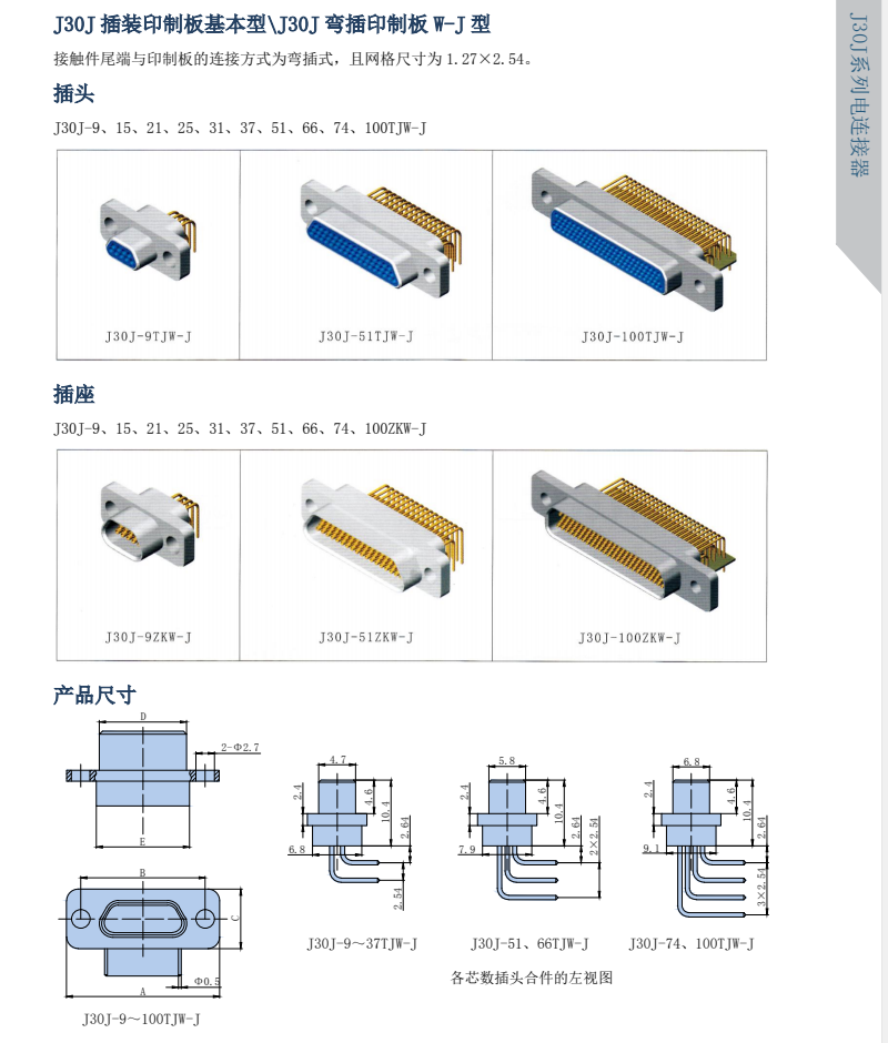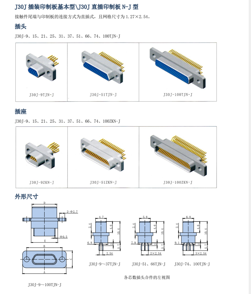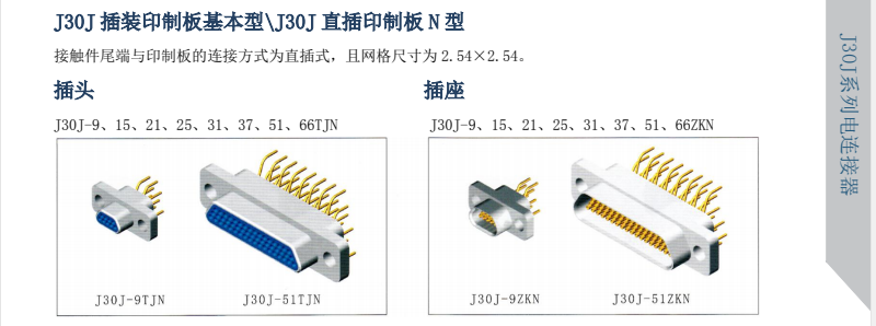 J30J基本型系列连接器,绞线式弹性插针,接点密度高,端接形式为焊接式,压接式,直插印制板、弯式印制板焊接,体积小,广泛用于仪器仪表设备之间的连接。