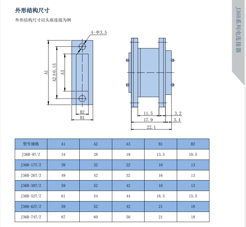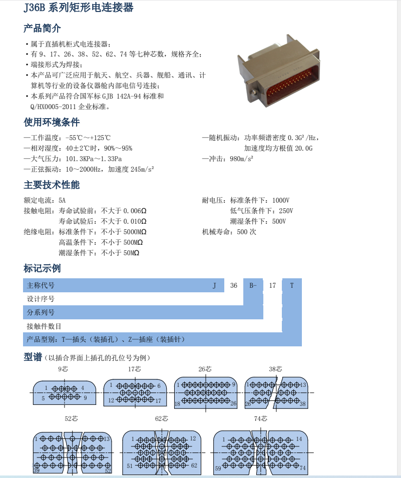 J36B系列矩形电连接器,在J14A系列连接器外壳上增加了防雨功能,密封好,插座面板式固定,带电缆,端接形式压接式,电缆规格、品牌、长度有用户确定。