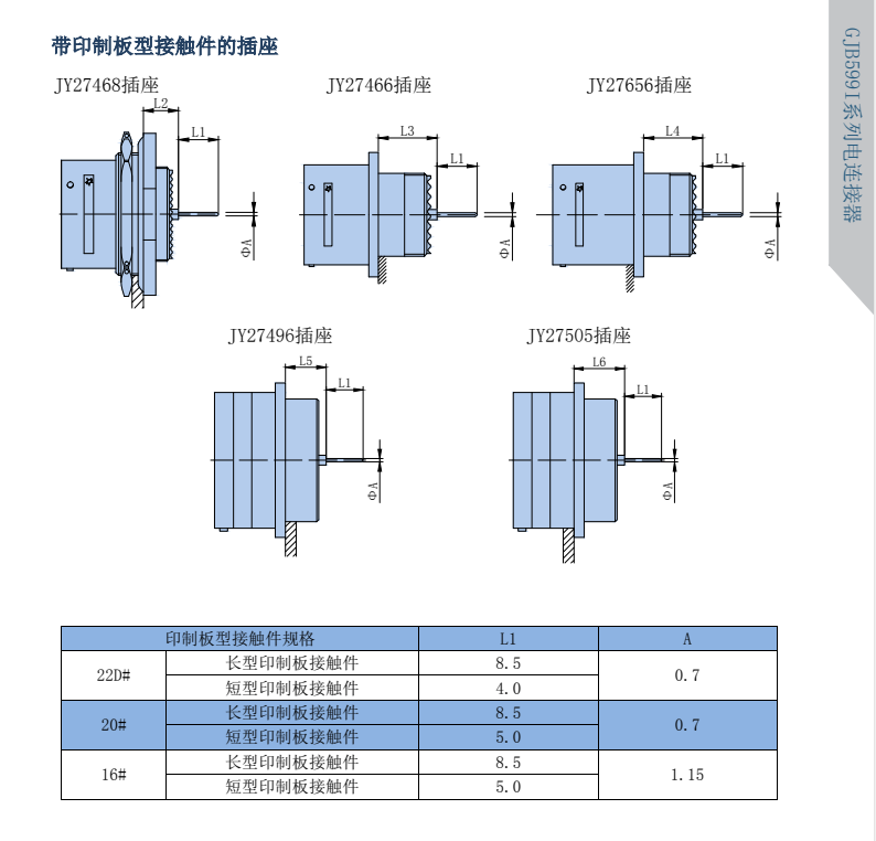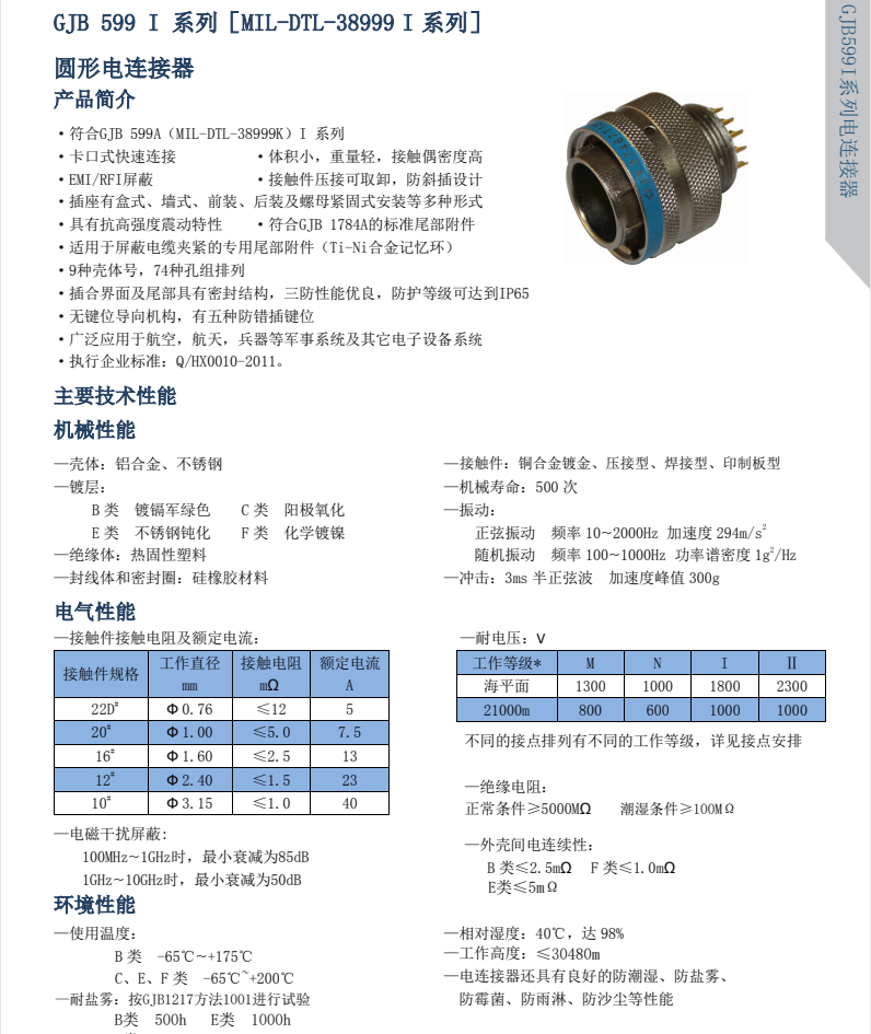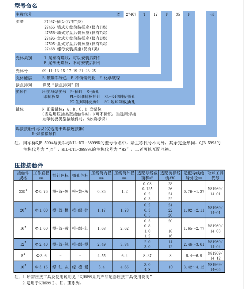 JY27467T17F35PH圆形599I系列航空插头,体积小,接触偶密度高,接触件压接可取卸,有防斜插设计,插座多种安装形式,有盒式,墙式,分前装、后装和螺母紧固式,配有屏蔽电缆夹尾部,广泛用于航空航天军事系统,及电子设备系统。